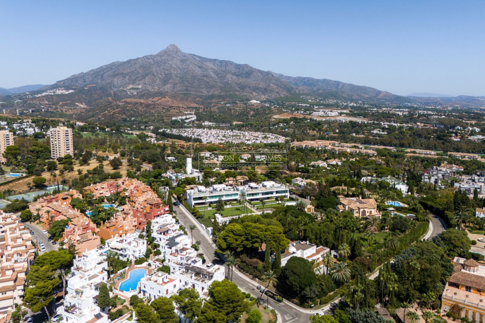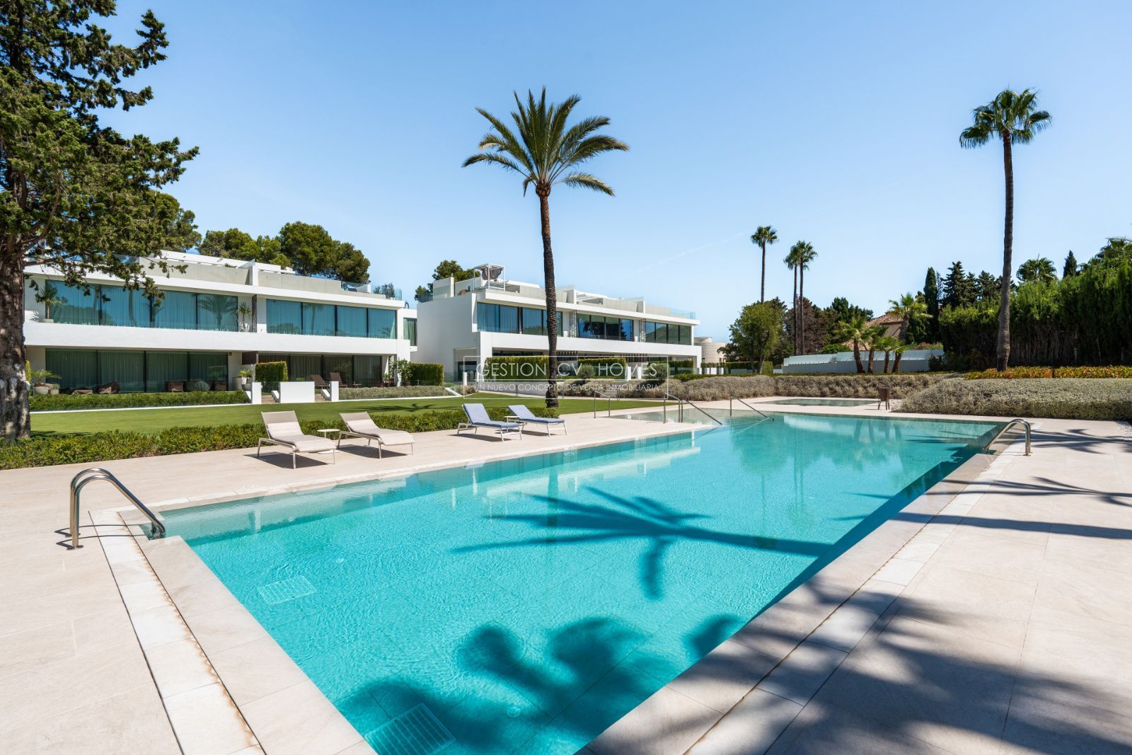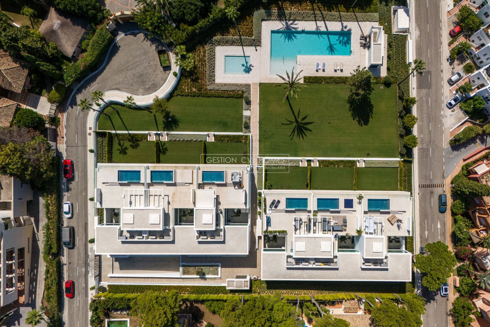 La urbanización privada ofrece jardines paisajísticos y una gran piscina compartida, creando un entorno tranquilo a la vez que se mantiene cerca de colegios internacionales, campos de golf, playas y los servicios de Puerto Banús y Marbella.