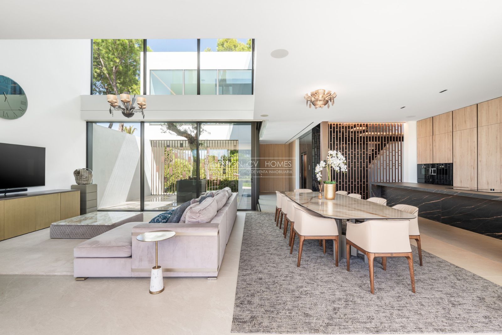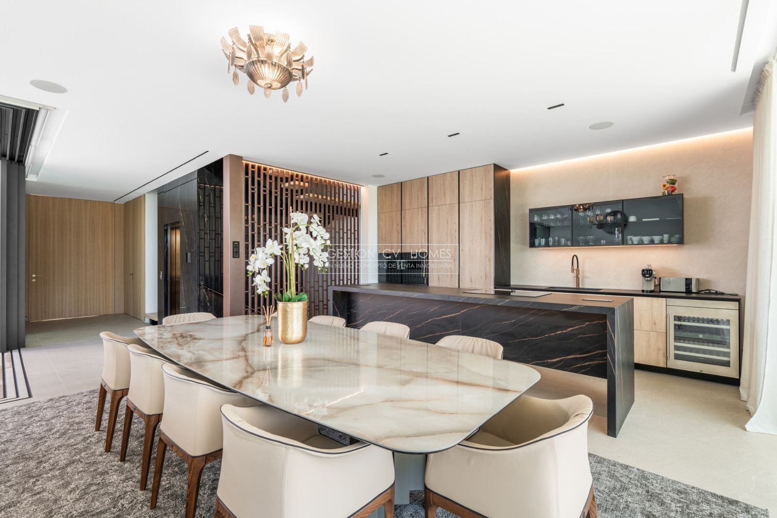 La planta principal cuenta con un salón-comedor de planta abierta que se extiende hasta una amplia terraza. Una cocina de diseño, equipada con electrodomésticos Gaggenau y con detalles minimalistas, crea un espacio culinario funcional y refinado.