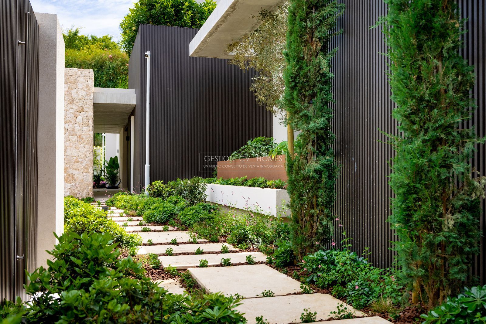 El jardín, cuidadosamente diseñado con vegetación escultórica y un toque artístico, complementa la elegancia arquitectónica de la casa. Ya sea relajándose en el spa interior, disfrutando de una velada junto a la piscina o desconectando en el cine en casa, esta es una casa donde cada detalle realza tanto la funcionalidad como la belleza.